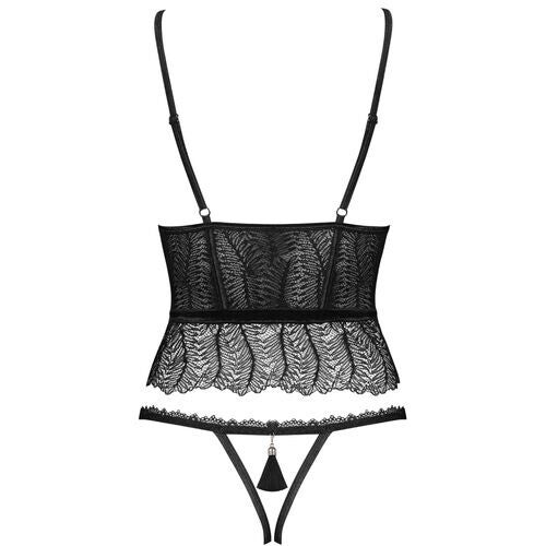 - El conjunto incluye un corset y tanga con una entrepierna abierta